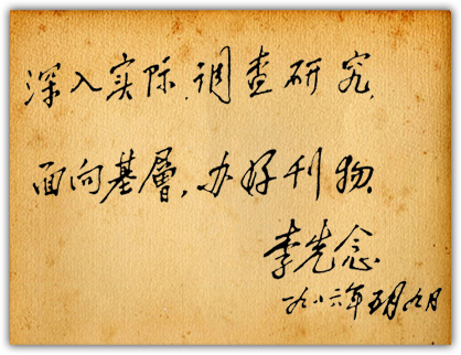 1986年5月 時(shí)任中共中央政治局常委、國(guó)家主席李先念為半月談?lì)}詞:深入實(shí)際,調(diào)查研究,面向基層,辦好刊物。