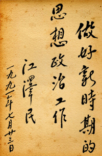 1991年7月 時(shí)任中共中央總書記江澤民為"半月談思想政治工作創(chuàng)新"題詞:做好新時(shí)期的思想政治工作