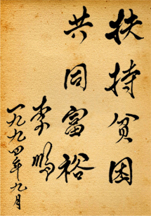 1994年9月 時(shí)任中共中央政治局常委、國(guó)務(wù)院總理李鵬為評(píng)選"全國(guó)十大扶貧狀元"活動(dòng)題詞:扶持貧困 共同富裕