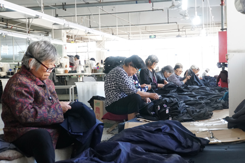 河南沈丘縣永盛服飾有限公司車間內,在家閑不住的老人們到車間打零工,掙點零花錢 王林園 攝