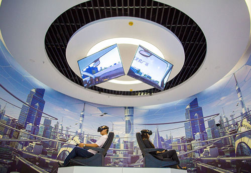 市民在內蒙古呼和浩特玉泉區大數據應用產業基地體驗VR眼鏡(2017年8月1日攝)。新華社發(丁根厚 攝)
