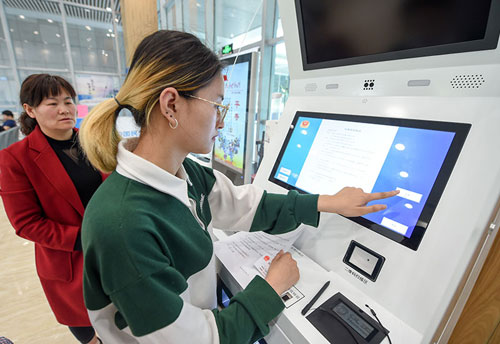 在南京市棲霞區商事登記服務大廳,市民用自動終端機辦理業務(3月29日攝)。新華社記者 李博 攝