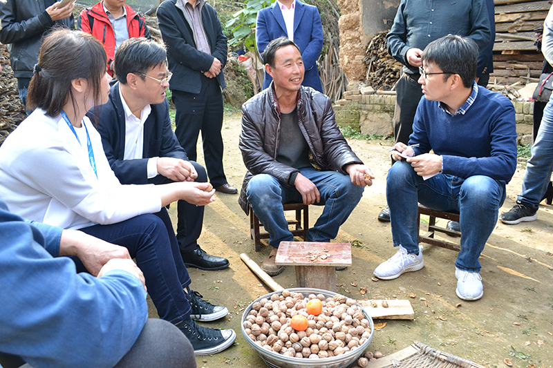 ▲ 核桃種植戶李現(xiàn)法(右二),向河南省商務(wù)廳電子商務(wù)辦公室副主任韓玉舟(左二),蘇寧鄭州地區(qū)管理中心副總經(jīng)理趙冬利(左一)介紹今年核桃的收成